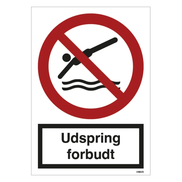 Dette forbudsskilt tager udgangspunkt i ISO 7010 piktogrammet “P052 No diving” fra ISO kategorien: P – Forbudsskilte.