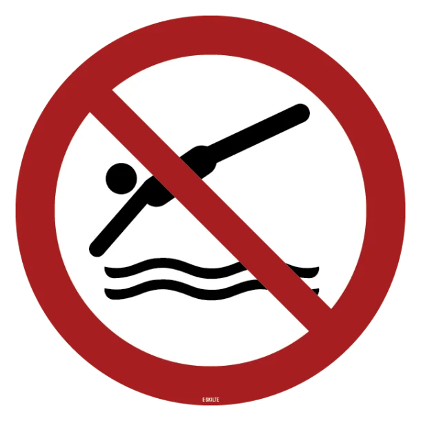 Dette skilt bærer en tydelig rød cirkel og diagonal linje over en person, der er i færd med at springe i vandet, hvilket universelt betyder forbud mod adfærden. Den simple, men effektive grafik sikrer, at budskabet forstås hurtigt, hvilket er afgørende i at forhindre ulykker og opretholde sikkerhedsstandarder.