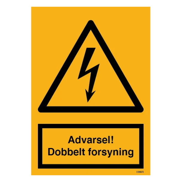 Skiltet kommunikerer klart og koncist om risikoen for elektrisk dobbelt forsyning, hvilket hjælper med at forhindre potentielle ulykker og skader.