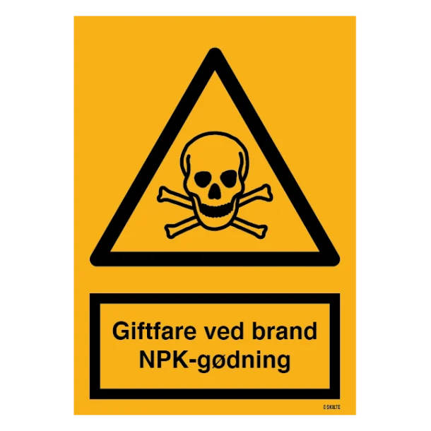 Vores advarselsskilt hjælper med at kommunikere vigtig information om de potentielle farer, som NPK-gødning udgør i tilfælde af brand. Piktogrammet er udformet i tråd med internationale standarder, hvilket gør det letgenkendeligt og sikrer, at beskeden om giftfare hurtigt og effektivt når frem.