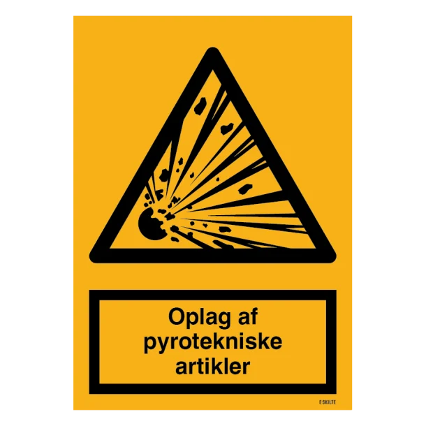 Dette advarselsskilte tager udgangspunkt i ISO 7010 piktogrammet “W002 Explosive material” fra ISO kategorien: W – Advarselsskilte.