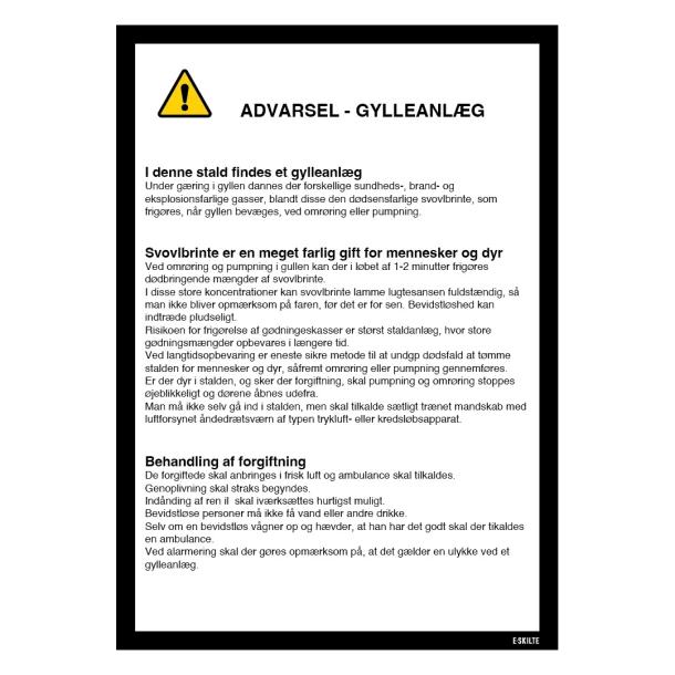 Skiltets præcise kommunikation om tilstedeværelsen af et gylleanlæg, de involverede risici og nødvendige forholdsregler ved forgiftning, gør det til et uvurderligt værktøj. Med en klar og tydelig tekst sikrer du, at alle er opmærksomme på de faremomenter, der sniger sig ind, når man arbejder tæt på gylleanlæg. Forbedr sikkerheden markant med denne vital information: