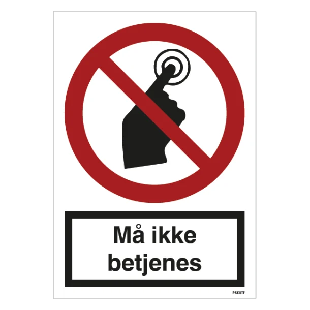 Må ike betjenes skiltet til landbrug består af et piktogram af en finger, der trykker på en knap. Henover piktogrammet er der en rød streg, som symboliserer, at den pågældende maskine ikke må anvendes. Skiltet er understøttet med teksten “Må ikke betjenes” for at tydeliggøre piktogrammets betydning. Skiltet anvendes typisk i områder, hvor der er maskiner eller værktøj, som kun må betjenes af autoriseret personale. Skiltet kan eksempelvis ophænges ved indgangen til et værksted.