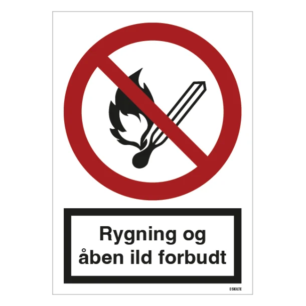 Vores skilt prydes af et piktogram af en tændstik i flammer, overkrydset af en tydelig rød streg. Denne visuelle kommunikation er suppleret med tekst, der entydigt forbyder rygning og brug af åben ild. Dette dobbelte budskab sikrer, at skiltets betydning forstås hurtigt og af alle, uanset sprogkundskaber.