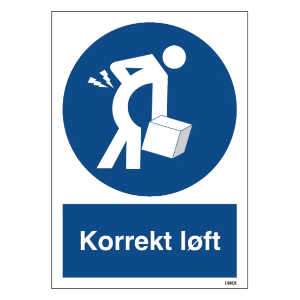 På skiltet er der illustreret et piktogram af en person, der håndterer en tung kasse. Det klare billede viser desværre også, hvad der kan ske, hvis kassen løftes forkert – smerter i ryggen. Denne type af skade kan være både langvarig og smertefuld, og derfor er forebyggelse nøglen til en sundere arbejdsstil. Med ordene “Korrekt løft” tydeliggøres betydningen af at anvende de rigtige teknikker.