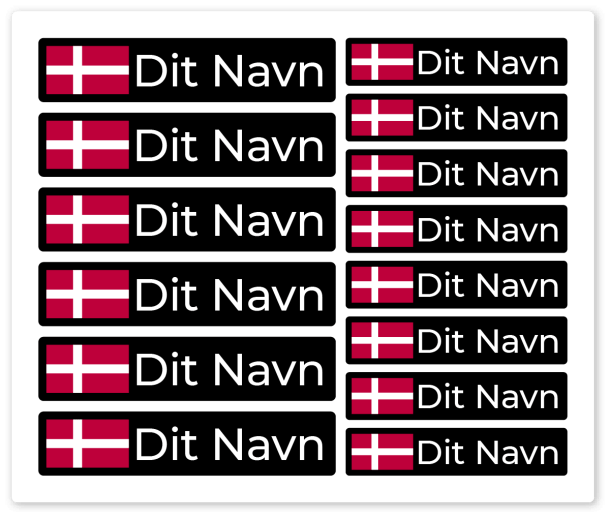Dine klistermærker kommer på et ark med 2 forskellige størrelser. De store klistermærker har en højde på 12 mm, og de små har en højde på 9 mm. Bredden afhænger af længden af dit navn.