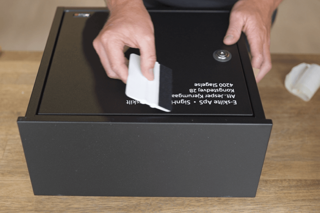 • Herefter bruger du din skilteskraber til, at sikre at tapen og klistermærket er glat.